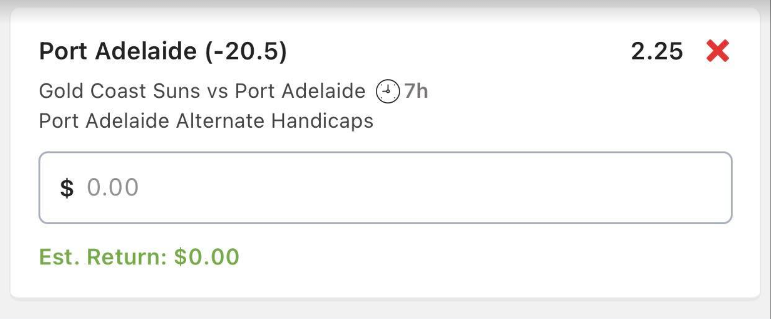 Port Adelaide -2.5, Stake 2.5 Units, Minimum Odds 2.0, Best Book - Lads/Neds