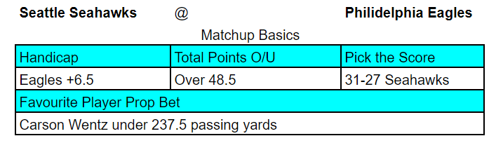 Player Props to follow this week include both running backs and both quarterbacks on the ground. Chris Carson over 53.5 rushing yards looks the best of the value followed by Russel Wilson over 28.5 rushing yards. Although there is value in Miles Sanders over 62.5 rushing yards I prefer the over 18.5 receiving yards. If you can find any Jalen Hurts rushing props the over will be terrific value. Tyler Lockett gets a better matchup than DK Metcalf this week so I would prefer over 74.5 receiving yards for Lockett but him scoring a touchdown may have slightly more value. Because of Wentz’s recent form and the fact of Hurts taking reps in training I can see great value in Carson Wentz to throw for under 237.5 passing yards.