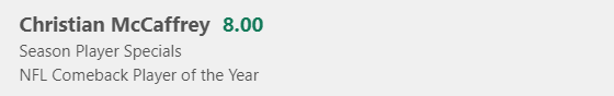 Comeback Player of the Year, Christian McCaffrey - Stake 1 Unit, Minimum Odds 7.0, Best Book - BET365