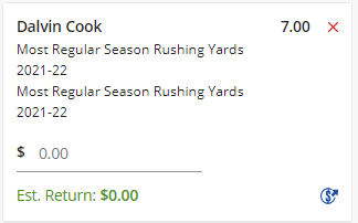 Season Rushing Champ, Dalvin Cook - Stake 0.5 Units, Minimum Odds 6.0, Best Book - Lads/Neds