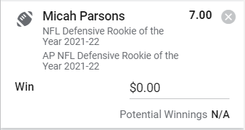 DROY, Micah Parsons - Stake 1 Unit, Minimum Odds 6.0, Best Book - Sportsbet