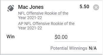 OROY, Mac Jones - Stake 1.5 Units, Minimum Odds 4.5, Best Book - Sportsbet