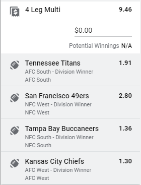 Division Winner Multi - Stake 1.5 Units, Minimum Odds 8.5, Best Book - Sportsbet