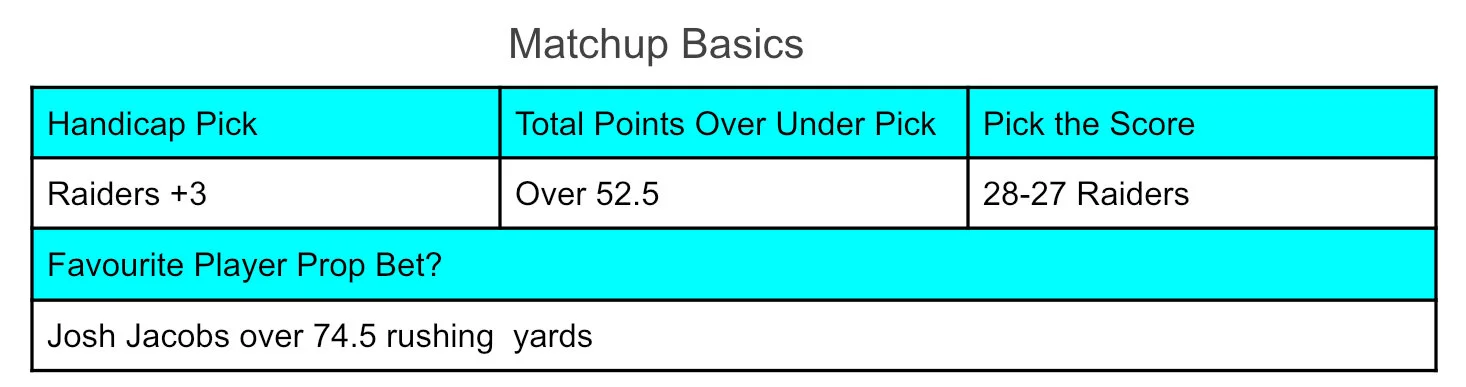 The Raiders are an ok football team that struggles with being one dimensional, and they are a dink and dunk team that has two passing plays, screens and tight end slants. They will likely be missing Henry Ruggs and Bryan Edwards which will again force them into playing that dink and dunk style as they lose the ability to stretch the field. The upset potential lies with Josh Jacobs and his power to punish one of the worst run defences in football. The Bills offence was great in the first half last week then collapsed in the second before pulling it back for a big drive at the end. The defence, however, has shown its not as good as has been advertised and there's going to be games where they don't show up. The Raiders were completely outcoached by Bellichick last week forcing them into making the plays the Patriots wanted them to make.