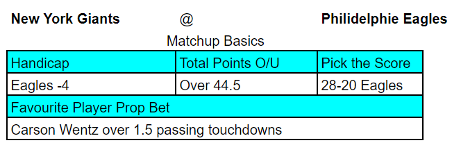 The run defense for both these teams is good coupled with the fact we're looking at 2 backup running backs and this game is going to be played through the air. Now the Giants are missing a lot of their offensive starters as well but their record against poor secondary’s this season has been good, the last 2 weeks vs the Cowboys and Washington they have put up a combined 54 points and can put up the points vs the eagles poor back end as well. Both these QBs are prone to turnovers and i can't see that changing this week with this being a good week to see some defensive touchdowns. The history for this matchup shows a very one sided affair with the Eagles dominating their recent bouts. The Giants have only won 4 out of the previous 22 times these teams have played and haven’t’t won in Philly since 2013.
