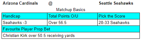 For the Cardinals, I like both Christian Kirk and Deandre Hopkins matchups this week, especially in the red zone. Kyler Murray over 55.5 rush yards seems great for a guy who has been using his legs consistently all season. Murray over 281.5 passing yards looks a nice number as I have been taking the yards over for all QBs playing the Seahawks this season.