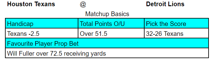 The Texan’s offense is soaring under Deshaun Watson as of late with the signal-caller scoring 15 TDs to only 2 INTs since Romeo Crennel took over. The offense has been prolific in the passing game with Will Fuller and Brandon Cooks forming a strong partnership out wide which has been good enough to make up for the lack of a run game. Watson’s rushing numbers have also greatly increased under Crennel averaging 31 yards per game compared to 14.5 beforehand. The Texans have also been one of the best teams at scoring away from home going 4-1 to the over in away games this season. The Houston offense is expected to be getting Laremy Tunsil back although the lack of Detroit pass rush mitigates this return, they are also expected to be without Randall Cobb but they have great depth at receiver with Keke Coutee set to play a big role in the offense.
