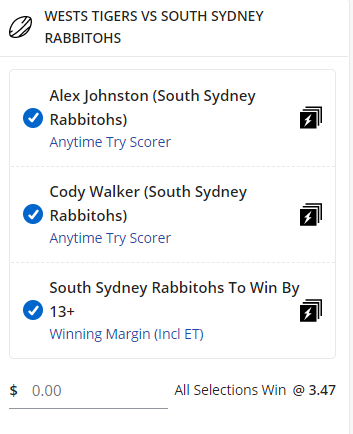 Rabbitohs SGM - Stake 2 Units, Minimum Odds 3.0, Best Book - Lads/Neds