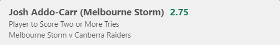 The Raiders have been weak in defence on their right edge in recent weeks and have allowed 6 tries to left-wingers over the last 4 weeks. Addo-Carr is still in the hunt for the top try scorer and the Storm will give him every opportunity possible to win the award.
