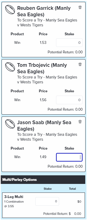 Manly SGM - Stake 2 Units, Minimum Odds 2.9, Best Book - Topsport
