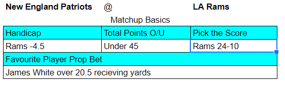 This is a stay away game for me. As you can see from Caveman's preview, there are just way too many variables in this game. There are no Rams rushing totals released yet, but there may be some value with Cam Akers if it gets listed. The only other overs I would go with are James White receiving over 20.5, and Josh Reynolds receiving yards over 27.5 as well. I will not be betting on the line, and although I do like the under, that would only be if it was still around 45, as it is currently dropping fast.