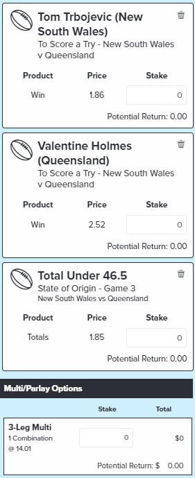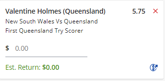 Valentine Holmes First QLD Try Scorer - Stake 1 Unit, Minimum Odds 5.0, Best Book - Lads/Neds