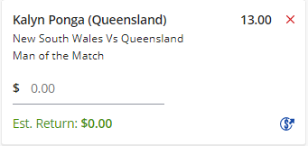 Player of the Match - Kalyn Ponga - Stake 0.5 Units, Minimum Odds 11, Best Book - Lads/Neds