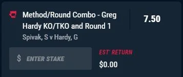 Greg Hardy by KO/TKO in RD1, Stake 1 Unit, Minimum Odds 6.0, Best Book - Pointsbet