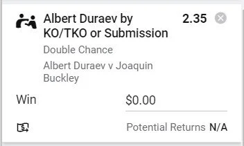 Albert Duraev Via KO/TKO or Sub - Stake 2 Units, Minimum Odds 2.1, Best Book - Sportsbet