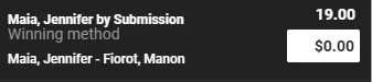 Today, we're kicking off our card by taking a big value bet on an underdog with upside. Manon Fiorot is being touted as a future title challenger but is taking her first huge step up in class here. Fiorot is predominantly a striker, but looking through her fights, she seems to attempt a lot of takedowns that will play into one of Maia's strengths on the ground. Maia has shown great armbar finishes before and if she comes in with a good game plan has every chance to pay off this considerable number. Maia, as good of a grappler as she is, struggles to get the fight to the mat, so a matchup with Fiorot may help bring this strength out. I also saw Fiorot limping a bit at the weigh-in, which may be nothing, but it may be another reason for Fiorot to get this to the mat.