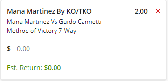 Mana Martinez by KO/TKO - Stake 2 Units, Minimum Odds 1.85, Best Book - Lads/Neds