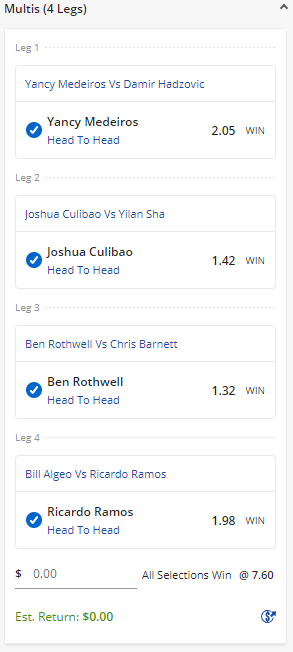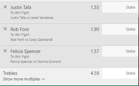 Fight Night 188 Prelim/Main card Multi - Stake 1.5 Units, Minimum Odds 4.7, Best Book - Lads/Neds