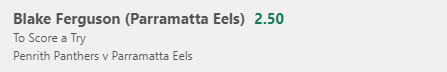 Blake Fergusson Anytime Try - Stake 1.5 Units, Minimum Odds 2.1, Best Book - BET365