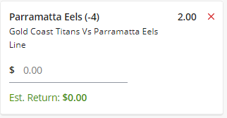 Eels -4, Stake 2.5 Units, Minimum Odds 1.9, Best Book - Lads/Neds