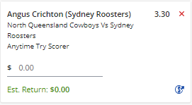 Angus Crichton Anytime Try - Stake 1.5 Units, Minimum Odds 2.8, Best Book - Lads/Neds