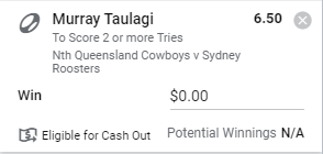 Murray Taulagi 2+ Tries - Stake 1 Unit, Minimum Odds 5.2, Best Book - Sportsbet