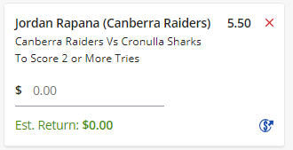 Jordan Rapana 2+ Tries - Stake 1 Unit, Minimum Odds 4.5, Best Book - Lads/Neds