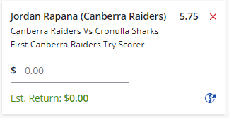 Jordan Rapana First Raiders Try Scorer - Stake 1 Unit, Minimum Odds 4.5, Best Book - Lads/Neds