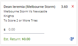 Dean Ieremia 2+ Tries - Stake 1.5 Units, Minimum Odds 3.1, Best Book - Lads/Neds