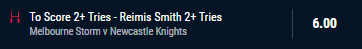 Remis Smith 2+ Tries - Stake 1 Unit, Minimum Odds 5.2, Best Book - Pointsbet