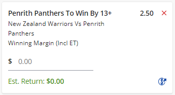 Panthers Win by 13+, Stake 2 Units, Minimum Odds 2.2, Best Book - Lads/Neds