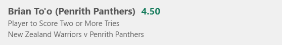 Brian To’o 2+ Tries - Stake 1 Unit, Minimum Odds 3.7, Best Book - BET365