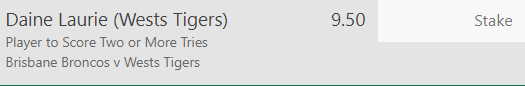 Daine Laurie 2+ Tries - Stake 1 Unit, Minimum Odds 6.5, Best Book - BET365