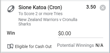 Sione Katoa 2+ Tries - Stake 1.5 Units, Minimum Odds 3.0, Best Book - Sportsbet