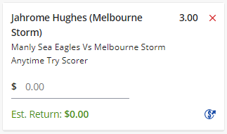 Jahrome Hughes Anytime Try - Stake 2 Units, Minimum Odds 2.5, Best Book - Lads/Neds