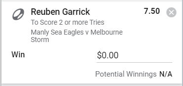 Reuben Garrick 2+ Tries - Stake 1 Unit, Minimum Odds 6.0, Best Book - Sportsbet