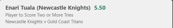 Enari Tuala 2+ Tries - Stake 1.5 Units, Minimum Odds 4.0, Best Book - BET365