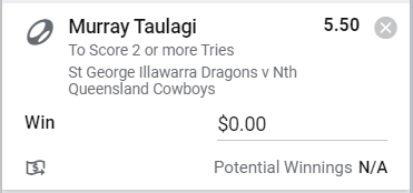 Murray Taulagi 2+ Tries - Stake 1 Unit, Minimum Odds 4.5, Best Book - Sportsbet
