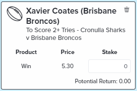 Xavier Coates 2+ Tries - Stake 1.5 Units, Minimum Odds 4.0, Best Book - Topsport