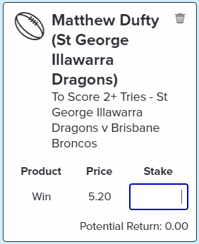 Dufty 2+ Tries - Stake 1 Unit, Minimum Odds 4.5, Best Book - Topsport