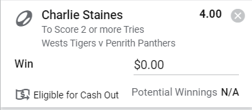 Staines 2+ Tries - Stake 1.5 Units, Minimum Odds 3.5, Best Book - Sportsbet