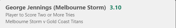 Jennings 2+ Tries - Stake 2 Units, Minimum Odds 2.8, Best Book - BET365