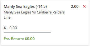 Sea Eagles -14.5, Stake 2 Units, Minimum Odds 1.9, Best Book - Lads/Neds