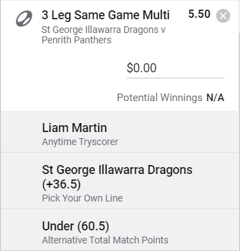 Panthers/Dragons SGM - Stake 1.5 Units, Minimum Odds 4.5, Best Book - Sportsbet
