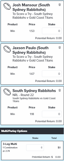 Rabbitohs SGM - Stake 2 Units, Minimum Odds 2.4, Best Book Topsport
