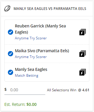 Sea Eagles/Eels SGM - Stake 1.5 Units, Minimum Odds 3.8, Best Book - Lads/Neds