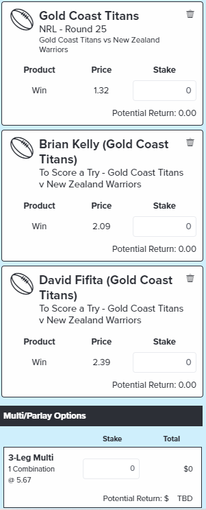 Titans Win SGM - Stake 1 Unit, Minimum Odds 4.8, Best Book - Topsport