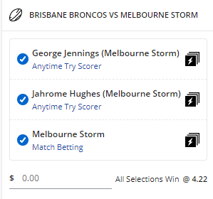 Storm/Broncos SGM - Stake 0.5 Units, Minimum Odds 20, Best Book - Sportsbet