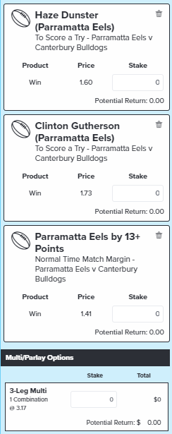 Eels Value SGM - Stake 0.5 Units, Minimum Odds 12, Best Book - Sportsbet
