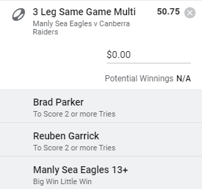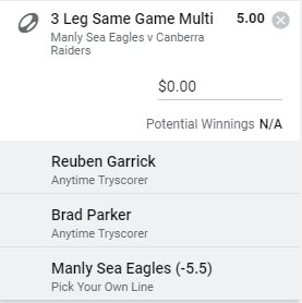 Sea Eagles SGM - Stake 1.5 Units, Minimum Odds 4.0, Best Book - Sportsbet